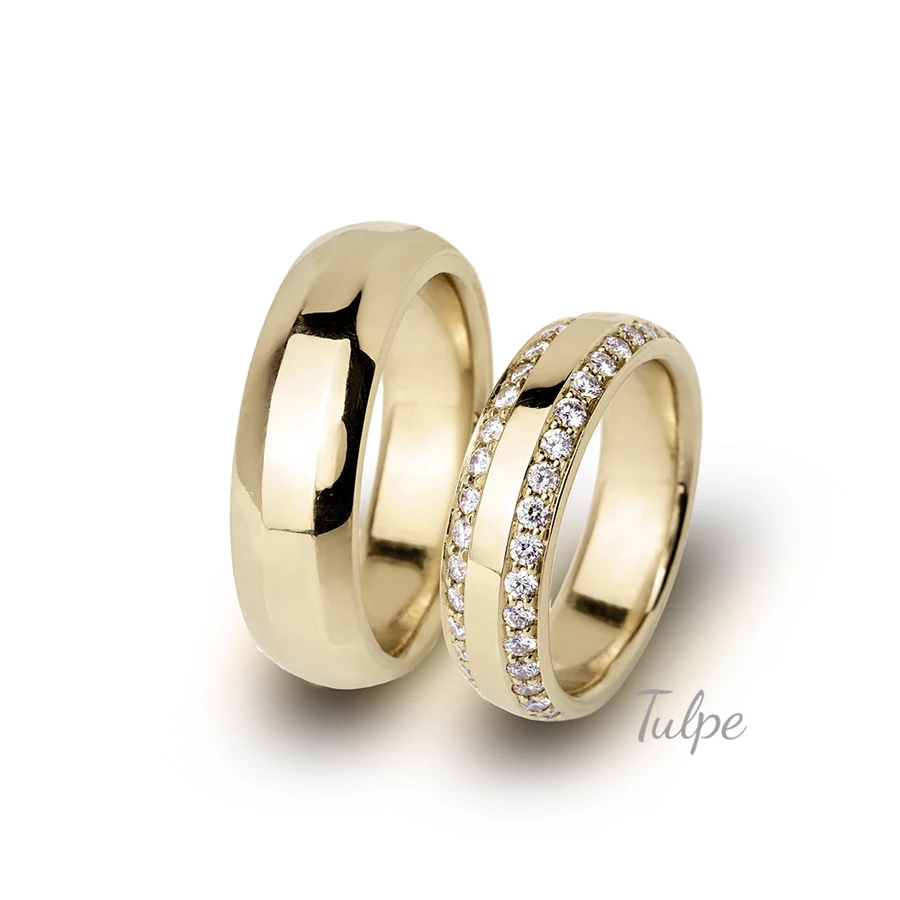 | Elegáns karikagyűrű pár, melynél a női darab két oldalon félig foglalva kövekkel, így nemcsak a forma miatt válik látványossá. Lehetőség van tetszőleges számú kővel rendelni. | |
