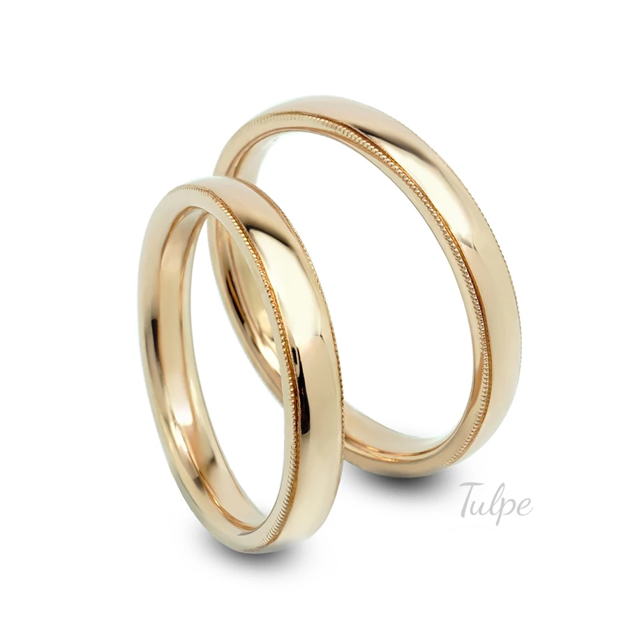 | Klasszikus 3 mm-es féldomború fazonú rozé arany karikagyűrű pár, hagyományos véséssel díszített szélekkel. | |